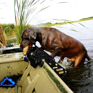 WAG's water dog ramp for sport hunting is a superior performing dog ladder for hunting boats and blinds. Unlike other duck boat dog ladders, ramps or platforms, the LM-6H provides a dog-friendly, stable, and easy-to-use ramp for your dog to get from the water into the duck boat or blind after a retrieve by themselves. No more setting your gun down to wrestle your dog back in.